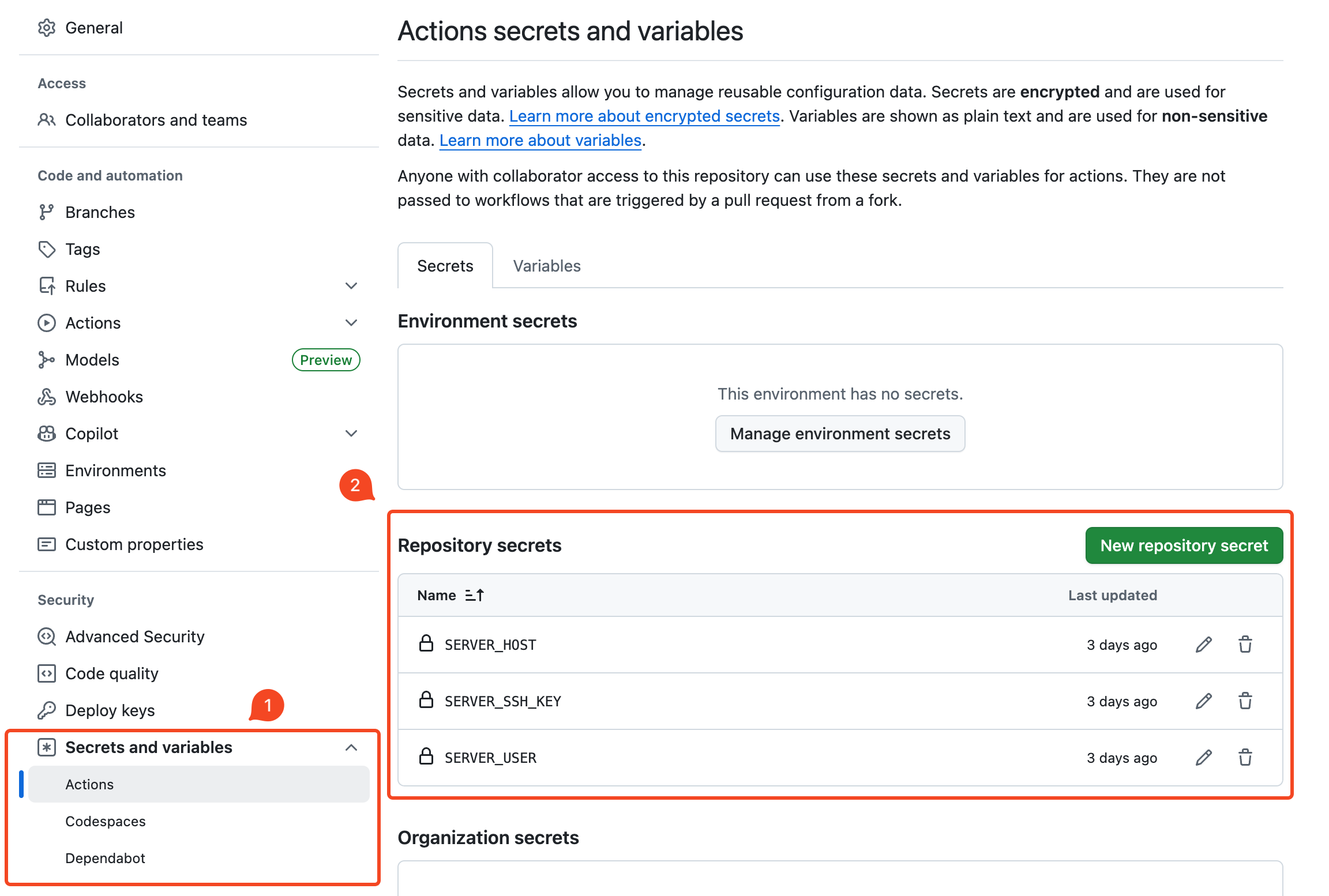 다음 세 가지 항목을 Repository secrets로 등록한다.