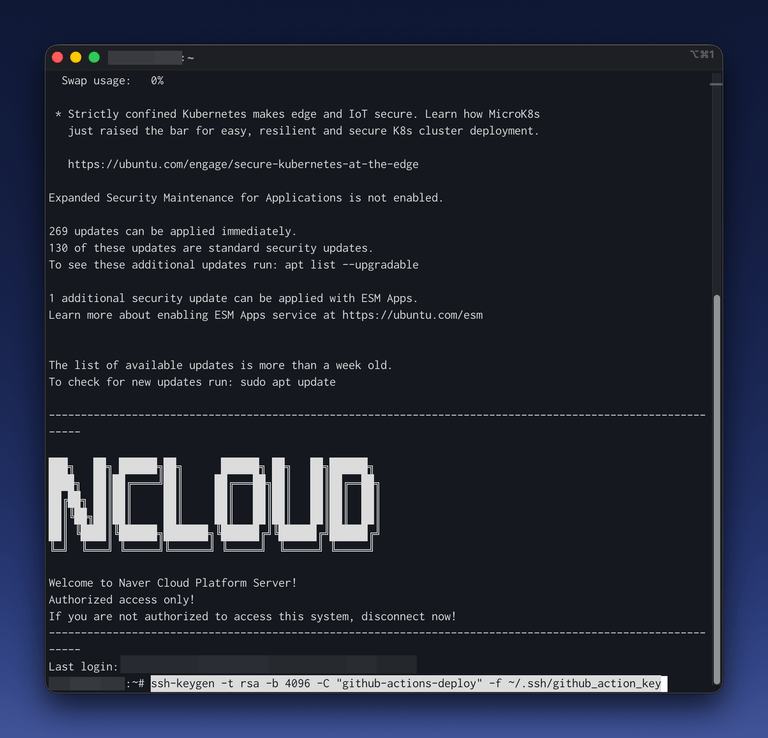 서버 터미널에 접속하여 다음 명령어를 실행한다. github_action_key는 원하는 파일명으로 변경해도 무방하다.